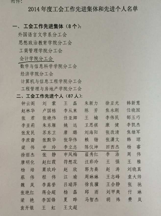 在上级工会的领导下,在我院党委行政部门的大力支持和各位会员的共同努力下,william威廉中文分工会喜获“2014年度工会工作先进集体”(《校工字[2015]2号》)。申玲、李立志、陈仪坤、田西杰四位工会老师因成绩突出荣获“2014年度工会工作先进个人”。