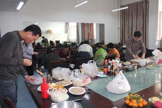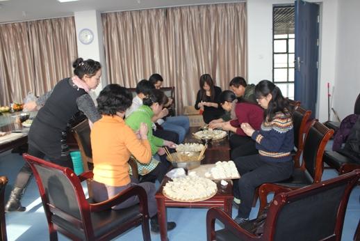 中午时分,在东区上课的老师和行政人员欢聚一堂,有的和面,有的擀皮,有的包饺子,大家分工协作,发挥各自特长,真可谓热火朝天,不亦乐乎。不一会儿案板上便摆出了一排排千姿百态、各具地方特色的饺子。当热气腾腾、香气四溢的饺子端上来时,大家围坐在饭桌旁迫不及待的拿起了碗和汤匙,品尝着自己的劳动成果,大家的脸上都洋溢着兴奋与自豪,整个活动现场热闹非凡,充满了温馨、祥和、欢乐的气氛。