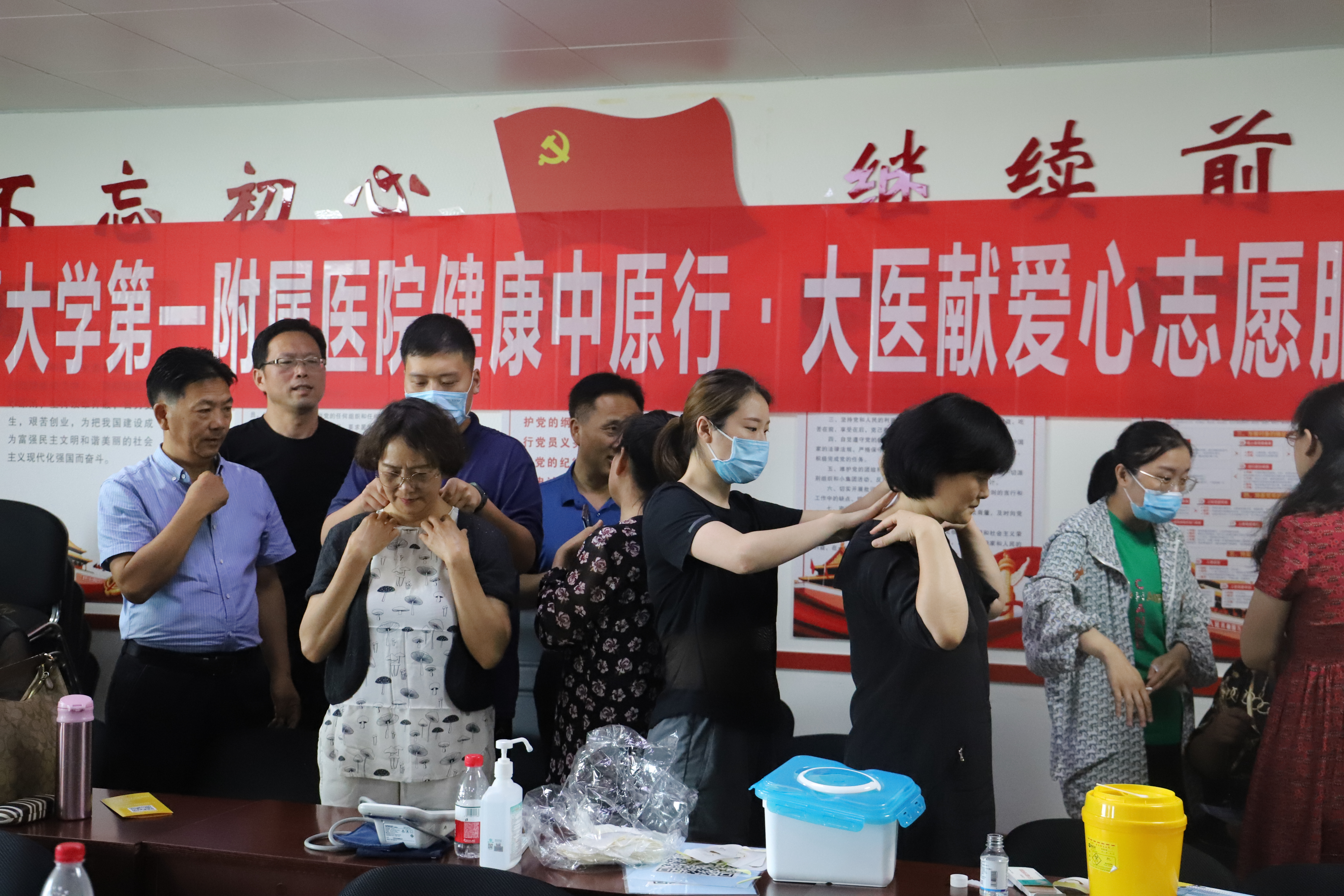 任主任的讲座深入浅出、贴近生活、实用性强,对于科学预防心脑血管疾病具有很好的指导意义。河南中医药大学第一附属医院龙子湖院区张朝阳医生的医疗团队还现场为老师们贴了三伏贴,进行了中医耳穴压豆治疗。