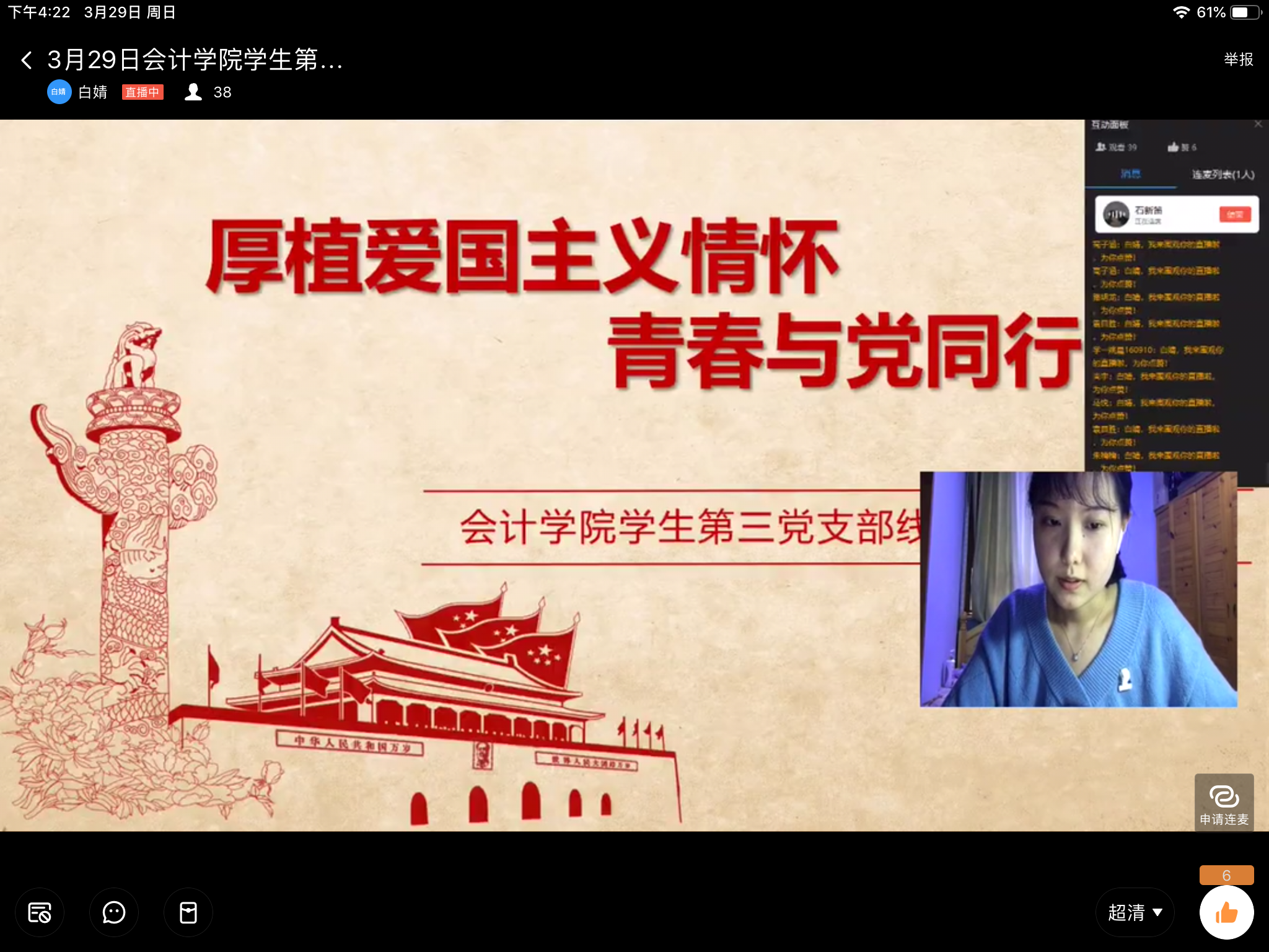 自3月23日起,各支部通过网络开展“把灾难当教材 与祖国共成长”主题党日活动,彰显制度优势,讲好抗疫故事,坚定报国使命。师生党员共同观看学习视频,宣传党中央国务院的决策部署以及各地支援湖北的实际行动,亲身讲述身边医护人员、志愿者的先进事迹和感人故事。