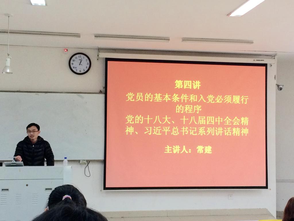 常建老师首先从最广泛的概念提出“我们是什么”,“我们在哪里”,“我们在干什么”三个问题,并围绕“公民”、“国家”、“政治权利”、“政治”、“政党政治”以及“政党”等词汇为以上提出的三问题作出了详尽的解释,旨在使同学们充分认识到党的性质、任务及纪律,端正入党动机,明确自身权利与义务,热爱并拥护中国共产党。此外,常建老师对党员的基本条件和入党必须履行的程序作了介绍,希望同学们积极学习党的十八大、十八届四中全会精神、习近平总书记系列讲话精神,汲取党的精神的营养,以发展的眼光看待自身寻求全面发展。最后,常老师根据入党党章点明党的队伍发展趋势是减少数量,提高质量,指出作为一名大学生,要想入党就必须品学兼优,要提高思想政治觉悟等。