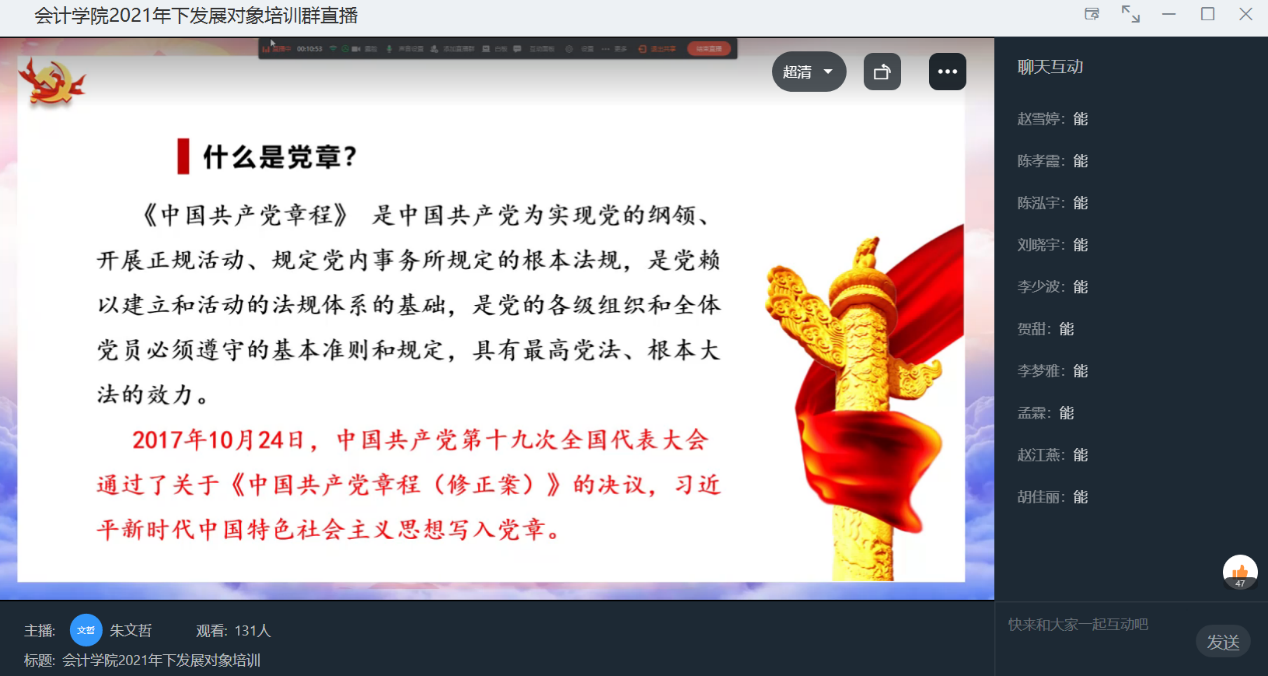 老师们带领同学们重温党史、重学《中国共产党章程》,回顾百年征程,从党的伟大奋斗历程中汲取继续前进的智慧和力量;以“传承党的伟大精神,开创新的伟大事业”为主题,带领同学们共同学习什么是党的伟大精神,党的伟大精神包含哪些内容,以及在新时代如何继承好发展好党的伟大精神;为发展对象梳理党的理论知识,回顾并总结往期培训内容,端正发展对象的入党动机。