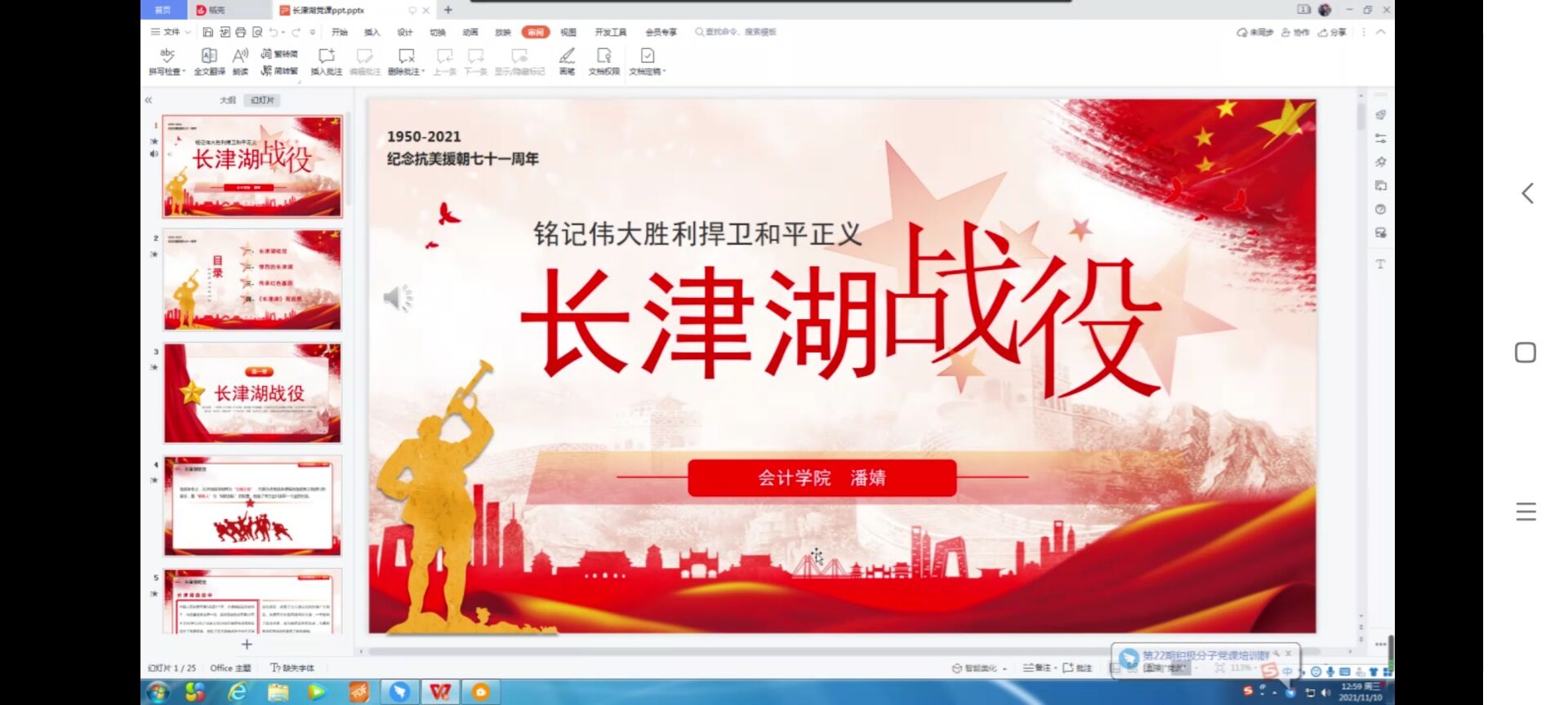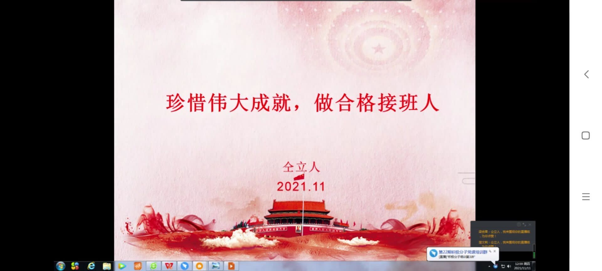 宋斌斌以《改革路上机遇与挑战并存,中国面临百年未有之变局》为主题,结合我国改革开放四十余年来的奋斗史和发展史,带领同学们深刻认识改革开放给国家富强、民族振兴和人民幸福带来的深刻变化、提供的重要动力;呼吁同学们站在百年未有之变局的当下,坚定理想信念,厚植家国情怀,厚重文化基础,为社会主义现代化强国贡献青春力量。18级辅导员潘婧以热播红色电影《长津湖》为切入点,通过对惨烈战役的回顾告诫同学们,铭记革命先辈们创造的伟大胜利,珍惜当下幸福生活,以实际行动捍卫世界和平发展。研究生辅导员仝立人带领同学们通过回顾新中国发展历程,引导同学们深刻认识新中国系列伟大成就的来之不易,呼吁同学们继承红色基因,以史为鉴,做合格的共产主义事业接班人。19级辅导员马莹莹系统总结本次系列培训,带领我院入党积极分子进一步提高站位、深化认识。