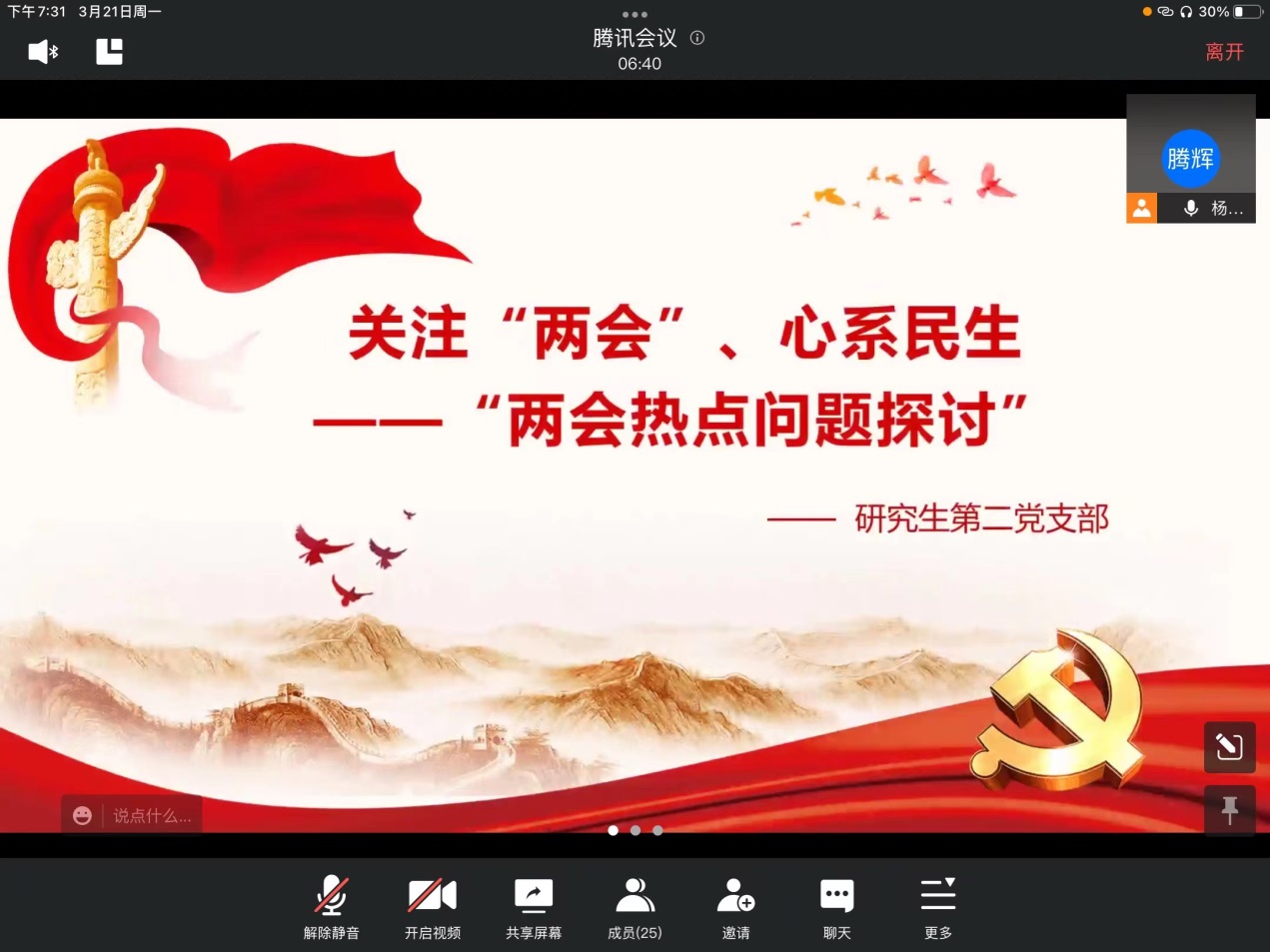 3月份,十三届全国人大五次会议和全国政协十三届五次会议先后在北京召开。为进一步提高支部党员同志的政治素养,引导同志们关注国计民生,增强责任意识、担当意识,william威廉中文研究生第二党支部近日举办了“热议‘两会’,心系民生”主题教育,支部全体党员参与活动,支部书记杨腾辉主持活动并领学。