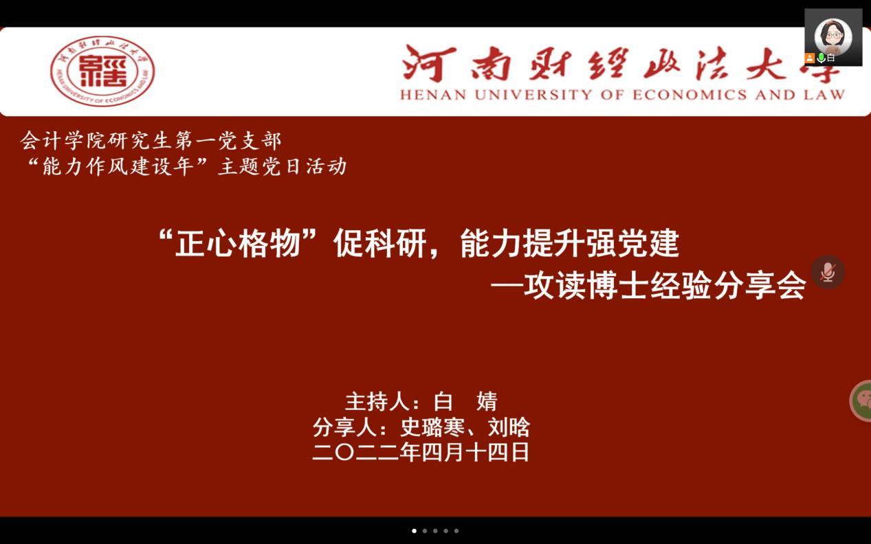 2022年4月14日晚,我院研究生第一党支部顺利开展了“‘正心格物’促科研,能力提升强党建”系列主题党日活动之攻读博士经验分享会。