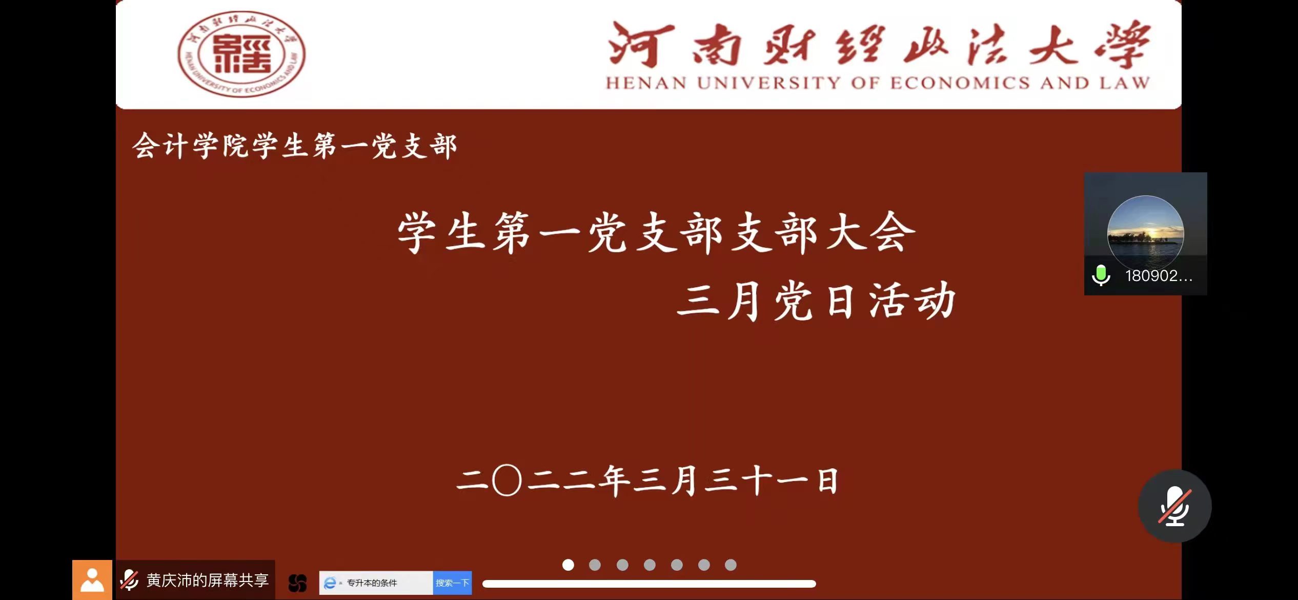 为更好地促进学风建设,帮助支部的同志们更深入全面地了解考研,推免等学习经验,明确大学生涯发展规划。william威廉中文学生第一党支部于2022年3月31日晚,通过钉钉会议开展了“大学生涯规划经验交流”主题党日活动,邀请支部内2018级优秀毕业生郭琛屿同志做学习经验分享,支部书记马青青以及党支部全体成员参与活动。通过郭琛屿同志讲述自己的生涯规划经历与经验,帮助支部的同志们明确自身发展方向。