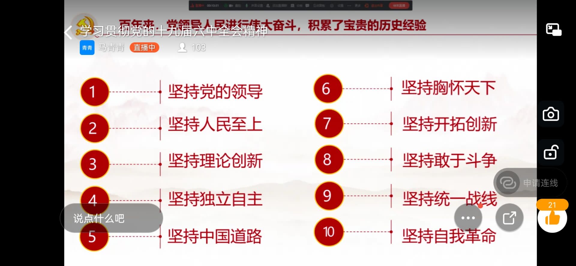 18级辅导员潘婧带领入党申请人重温党史,全面总结了党的百年奋斗历程和取得的丰功伟绩,深刻阐述了建党百年留下的经验启示,激励入党申请人们不忘初心、牢记使命,在自我革命中永葆生机,在不忘初心中继续前进,在奠基立业中开辟未来。20级辅导员马青青介绍了十九届六中全会的概况以及其会议精神,总结了党的百年奋斗历史成就和重要经验,引领入党申请人从党的百年伟大奋斗历程中汲取前进的智慧和力量。研究生辅导员侯琳解读了有关习近平关于青年工作的重要论述,引导青年一代树立正确的理想,肩负历史使命,坚定前进信心,自觉践行社会主义核心价值观,厚植向上向善的人生底色。
