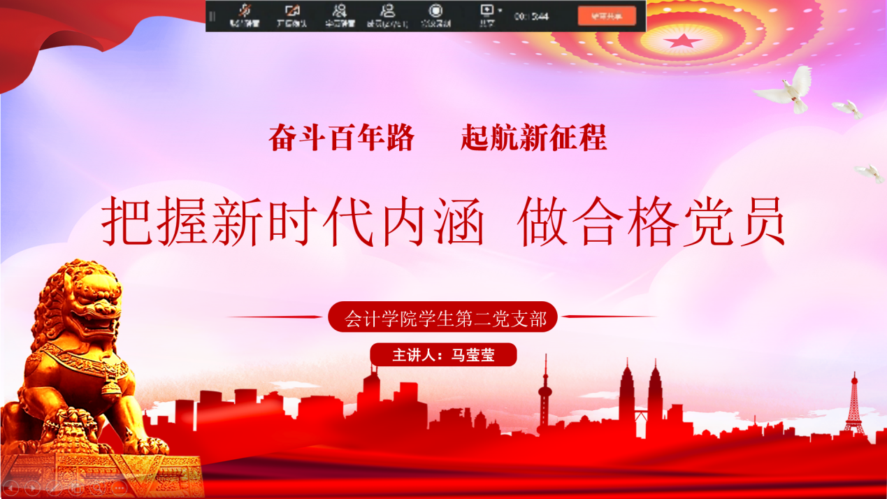 为引领广大青年学生深入学习贯彻习近平新时代中国特色社会主义思想,william威廉中文学生第二党支部于5月19日举办“把握新时代内涵,做合格党员”主题党课。本次活动采取线上方式举办,由支部书记马莹莹主持。