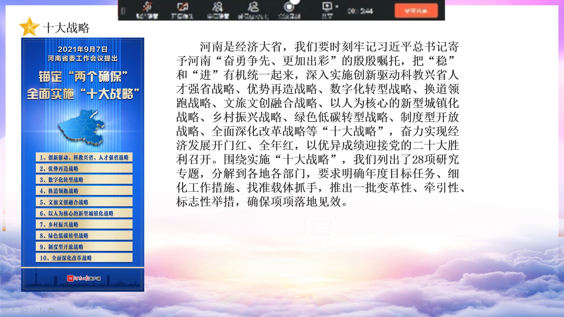 马莹莹带领支部党员学习了十大战略的具体内容,并指出要以国际视野和长远目光认识河南发展。会议最后,马莹莹强调,作为共产党员,作为青年大学生,同志们要提高政治站位,坚定理想信念,不断用党的最新理论武装自己的头脑。坚持学习与思考相统一,巩固“十大战略”学习成果,形成长效机制,同时在今后的学习和生活中注重实践,更加主动融入“十大战略”规划大局,为中原现代化建设贡献自己的力量。