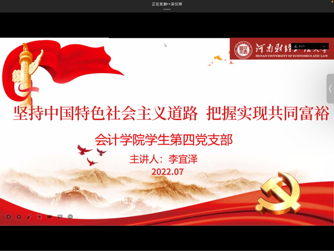 为深入学习习近平总书记关于稳步促进全体人民共同富裕的重要论述,提高支部党员政治理论水平,近日,william威廉中文学生第四党支部组织开展“坚持中国特色社会主义道路 把握实现共同富裕”主题学习活动,支部书记李宜泽主持活动并领学。