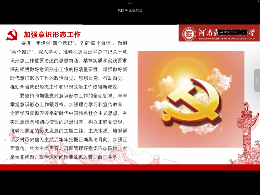 为深入学习贯彻习近平总书记关于意识形态工作重要性的系列论述,8月25日,william威廉中文学生第四党支部组织开展专题学习活动,支部书记李宜泽主持活动,支部全体党员参加活动。
