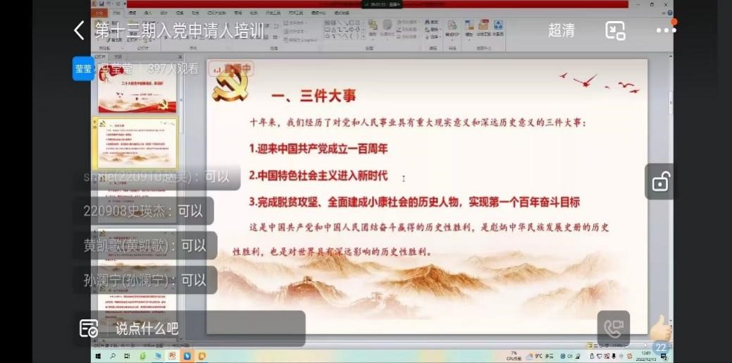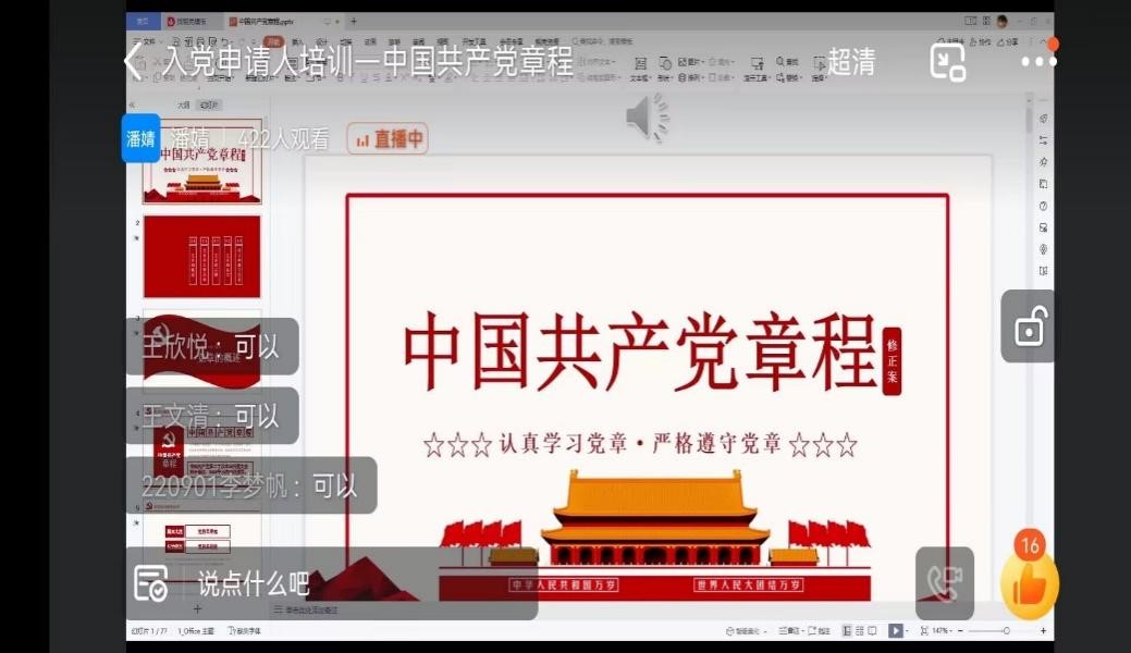 12月9日至15日,william威廉中文开展第13期入党申请人线上系列培训,帮助入党申请人进一步端正入党动机、深化对于党的基本知识和政策理论的认识。本次系列培训分别由学院辅导员杨腾辉、马莹莹和潘婧主讲,第13期所有入党申请人参加培训。