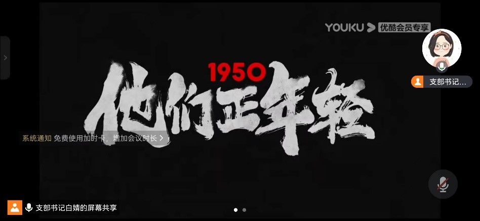 本次活动由两部分构成。活动第一部分,支部书记白婧以“岁月峥嵘,不忘初心”为主题介绍了中国人民解放军的优良作风及发展情况,丰富了支部成员的军史知识,提高了支部成员的拥军意识;活动第二部分,支部组织大家线上观看了《1950他们正年轻》纪录片电影,学习了解影片中抗美援朝战斗英雄可歌可泣的事迹,回顾了无数先辈抛头颅、洒热血的峥嵘岁月。通过这群曾经正年轻的历史真实见证者的讲述,支部成员认识到作为党员如何做到坚定信仰和对党忠诚,自觉对照党员标准提升自我。
