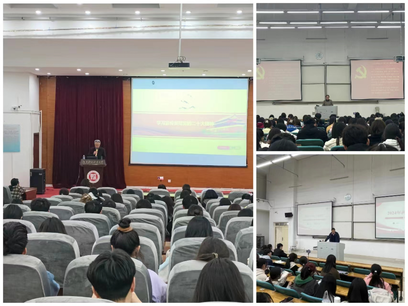 贺捷围绕学习宣传贯彻党的二十大精神,详细阐述了党的二十大的重要意义和主题,点明了学习贯彻党的二十大精神的重要性,引导大家全面学习贯彻党的二十大精神,并融入日常学习工作中;田西杰以贯彻习近平新时代中国特色社会主义思想为主题,鼓励同学们不断培育和创造新时代中国特色社会主义文化,推进中华民族伟大复兴;张肖飞从2024年两会精神报告入手,介绍了2024年两会五大看点和政府工作的十大任务;白婧以学习党建工作知识为切入点,要求同学们坚定政治立场,不仅要积极从组织上入党,更要从思想上入党,做一名合格的共产党员;潘婧对《中国共产党章程》的主要内容进行介绍,使同学们对党的性质和宗旨、路线和纲领、指导思想和奋斗目标等有了更加深入全面的了解。