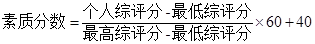 素质成绩由学术及创新类计分、竞赛奖励类计分、综合性奖励计分三个模块构成。三个模块的原始计分首先加总,计综评分,再对综评分按以下公式进行数据标准化处理后,记为素质成绩,满分100分。