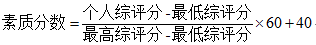 素质成绩由学术及创新类计分、竞赛奖励类计分、综合性奖励计分三个模块构成。三个模块的原始计分首先加总,计综评分,再对综评分按以下公式进行数据标准化处理后,记为素质成绩,满分100分。
