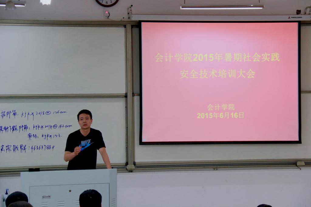 培训会上,团委的相关负责人首先介绍了今年暑期社会实践工作的总体安排,对社会实践的具体工作进行布署。随后,往届暑期实践优秀团队队长黄凯、张得龙、牛开轩和郭琳薇四位同学分别以乡村支教、财务实践、社会调研、校友回访为主题,结合自身经验,从开展社会实践的各个具体方面向同学们提出了有益建议。紧接着,丁书记鼓励同学们积极挖掘身边热点问题,结合自身专业背景,通过暑期社会实践的平台了解社会,将实践工作做精做深,形成一批有价值的实践成果。最后,为进一步加强暑期社会实践团队的安全教育,丁书记在交通安全、人身财产安全、住宿安全、饮食安全等方面进行了着重强调,嘱咐大家在实践前应充分了解实践地的具体情况,并与实践接收地保持密切联系,以确保团队在安全的情况下进行实践活动。