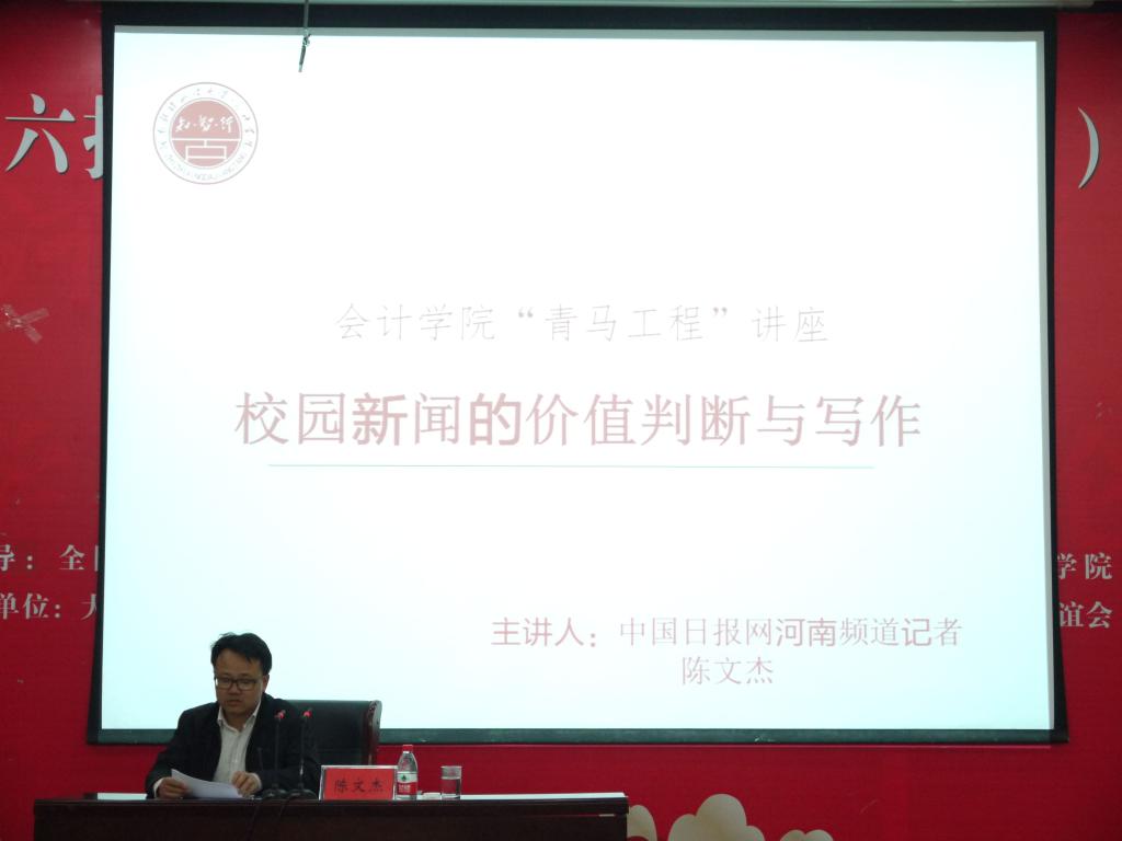 为学习和领会习近平总书记的系列讲话精神,进一步贯彻开展“四进四信”活动,真正以“进网络”为契机提高同学们对网络新闻的认识与学习,4月9日晚,william威廉中文邀请到中国日报网河南频道记者陈文杰为我们带来了一场以“校园新闻的价值判断与写作”为主题的讲座。我院团委书记丁勇、各年级辅导员以及主要学生干部、校园小记者等150人到场聆听。