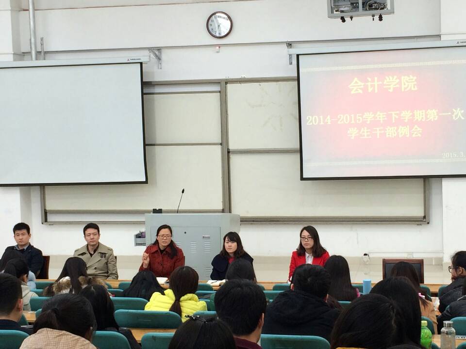 会议传达了学校的相关文件精神,并结合我院实际情况部署了新学期的主要工作,强调全体学生干部要一如既往地开展好常规性工作,积极在学生建设、班级文化创建、安全文明建设等方面取得新突破、新进展;继续发挥优良传统,开展丰富多样的案例分析大赛,让理论素养的提升与实践能力的增强融会贯通,从而为学生全面发展赢得先机;务实活动内容和形式,结合学生自身需要开展公考、ACCA考试经验交流会和学生干部培训会,促进学生综合素质提升。最后,李书记以时下热议的《柴静雾霾调查:穹顶之下》记录片为契机,引导学生干部要加强思想政治建设,宣传和引导正能量,树立文明意识,齐心协力为学校的省级文明单位建设贡献一份力量。