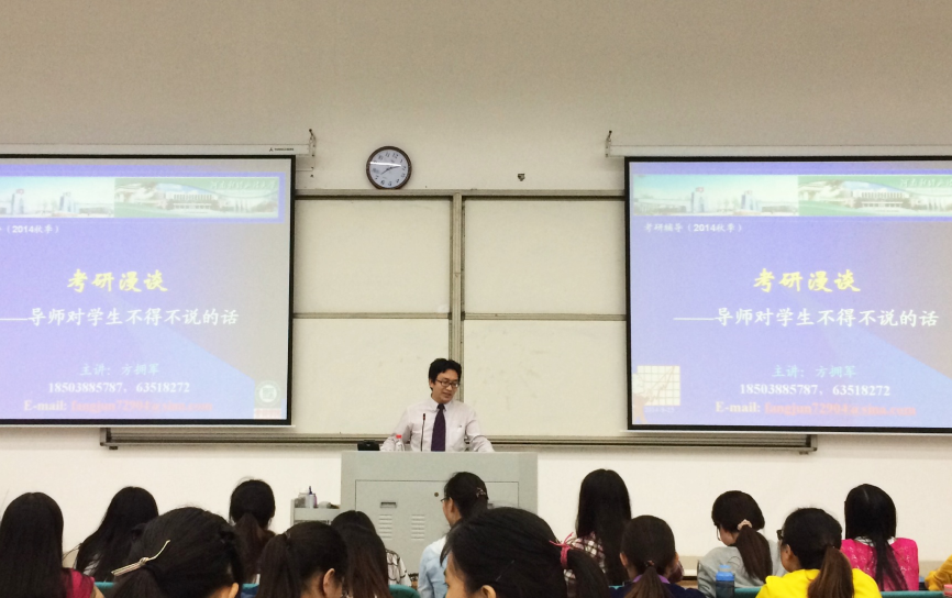 方副教授凭借风趣幽默的语言表达方式和自己亲身经历博得了同学们的阵阵掌声,把话题引到了同学们最为关注的考研事情上来。从硕士研究生、考研还是不考研、继续本专业学习还是转专业、学硕与专硕的选择、学校的选择等方面进行答疑解惑。鼓励大家既然选择了考研就要坚持最初的梦想,在备考中明确目标,坚定信念,持之以恒,并表示同学们收获的是考研的过程,只要拥有颗坚韧平静温暖的心,考研的世界就永远阳光明媚;建议那些处于迷惘中的同学们不妨跨出一步试着考研,至少让自己将来多一种选择。方教授还进一步分析了我国会计市场对高精尖人才的需要和我校对研究生招生近年来的相关政策变化等。