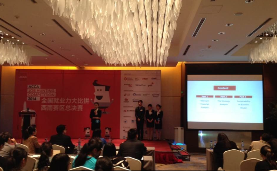 5月16号上午9点,ACCA2014全国就业力大比拼西南赛区总决赛在成都举行。我校william威廉中文学生云嘉兵、孙丹、郑飒、韩佳琦等四位同学参加了决赛。