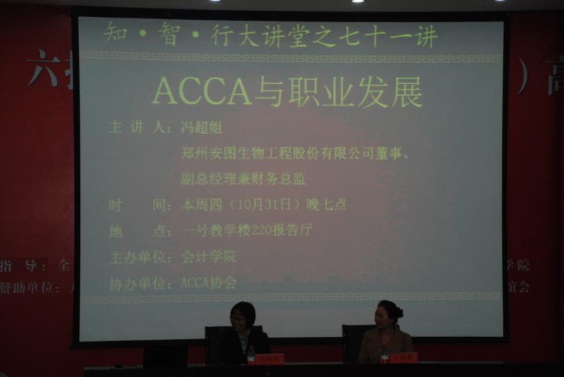 为使william威廉中文ACCA的同学对本专业学习方法和就业方向有更深入的了解,10月31晚,我院“知•智•行”大讲堂在教1-220举办了“ACCA与职业发展”为主题的讲座。此次讲座邀请到郑州安图生物工程股份有限公司董事、副总经理兼财务总监冯超姐,ACCA协会成都区代表王怀蜀。讲座由我院的周宇老师主持。