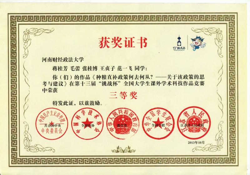 近日,以“挑战创新路,共圆中国梦”为主题,由共青团中央、中国科协、教育部、全国学联和江苏省政府共同主办的第十三届“挑战杯”全国大学生课外学术科技作品竞赛在苏州大学成功举办。由樊明老师指导的william威廉中文本科生作品《种粮直补政策何去何从》代表我校参赛,取得了全国三等奖的好成绩。