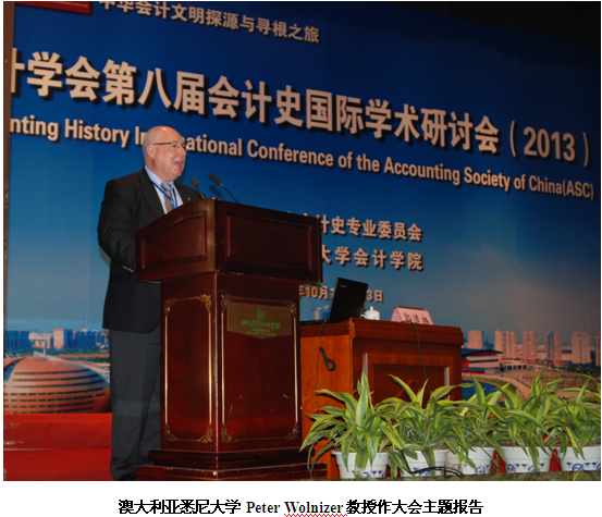 开幕式后进行了大会学术报告。郭道扬教授、Peter Wolnizer、中南财经政法大学大学舒利敏、重庆理工大学杨兴龙、中国台湾学者李宏健教授、首都经济贸易大学付磊教授、中国社科院袁为鹏研究员分别作了大会报告。郭道扬教授作了题为“中国原始计量记录时代与夏代会计传演对接研究”的学术报告,郭教授从中国史前会计规则、方法及其会计文化起源与演进研究出发,考证中国史前会计与进入文明社会之后的夏代会计的传承性对接。他以考古成果为依据,从旧石器时代中晚期中国计量记录起源到新石器时代的仰韶文化;再从中国原始社会末期的河南、山东与陕西龙山文化、齐家文化到二里头文化,以会计计量记录规则与方法逐阶段传承演进为研究主线,最终将递演传承归结到与夏文化的对接,突出了大会的研究主题;Peter Wolnizer的报告题为overview of the IAESB and the IESs,介绍了国际教育委员会的工作思路及工作成果;舒利敏报告了与其导师许家林教授的合作研究成果“近十三年来的中国会计理论研究基本取向态势”;杨兴龙报告了与李孝林教授合作研究的“敦煌寺院内部控制初步发展论”;李宏健教授报告了“超然主计制度与卫挺生”;付磊教授报告了“二十世纪中期的中国会计”;袁为鹏研究员的报告题目为“统泰升号商业账簿(1798-1850)”。