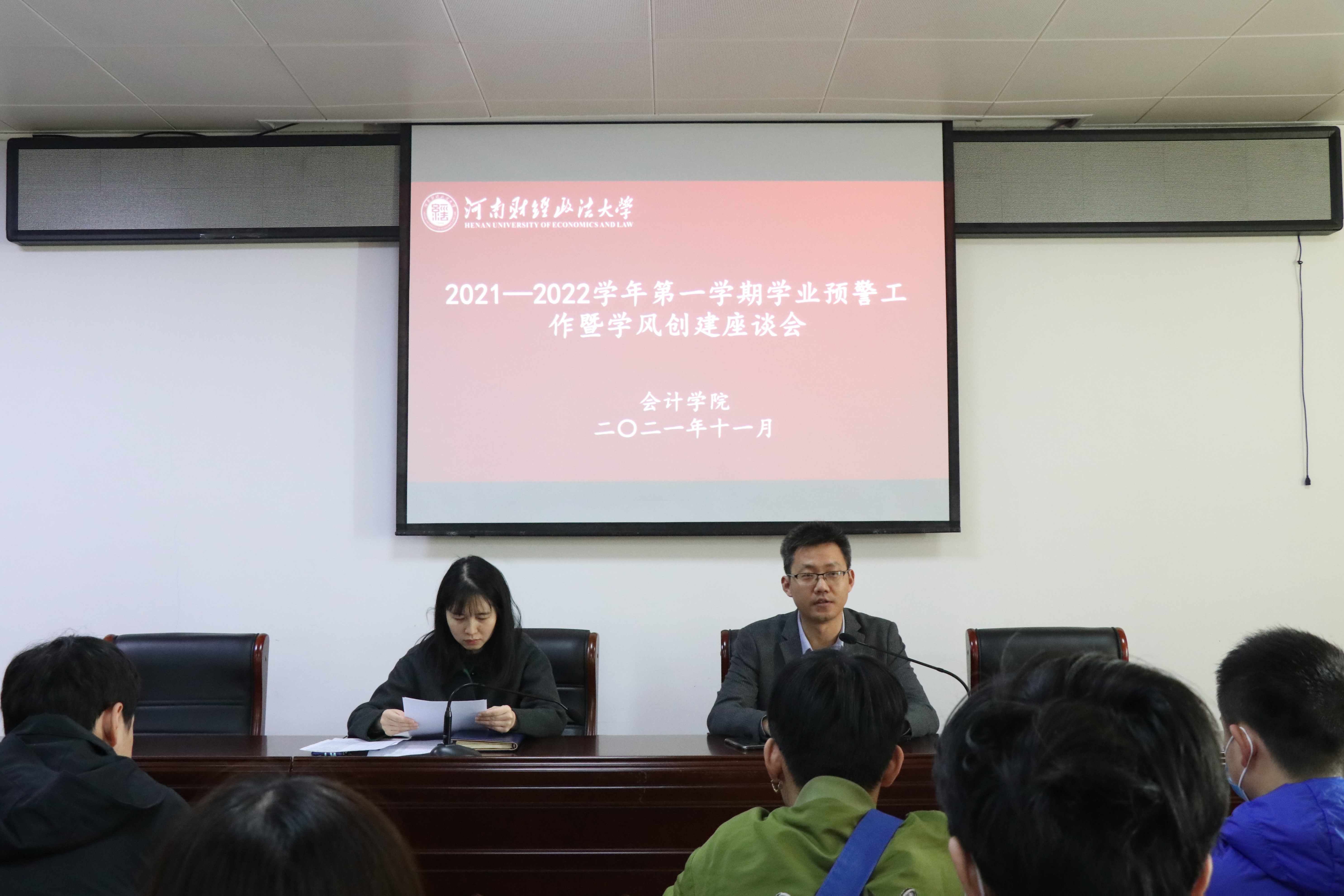 11月25日,william威廉中文在郑东校区教学科研楼727会议室举办2021-2022学年第一学期学业预警暨学风创建座谈会,学院党委副书记宋斌斌、团委副书记朱文哲及40余名学业红色预警的学生共同参加了此次座谈会。