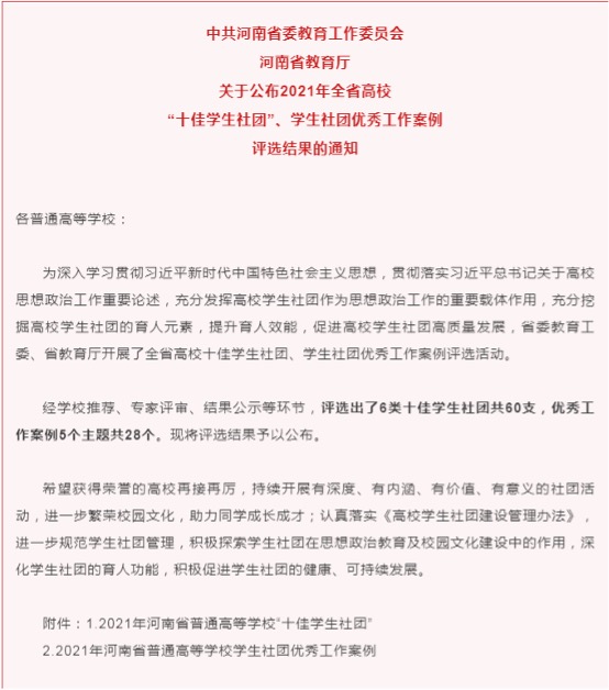 为深入学习贯彻习近平新时代中国特色社会主义思想,充分挖掘高校学生社团的育人元素,提升育人效能,省委教育工委、省教育厅开展了全省高校十佳学生社团、学生社团优秀工作案例评选活动。william威廉中文春雷话剧社成功入选河南省十佳学生社团。