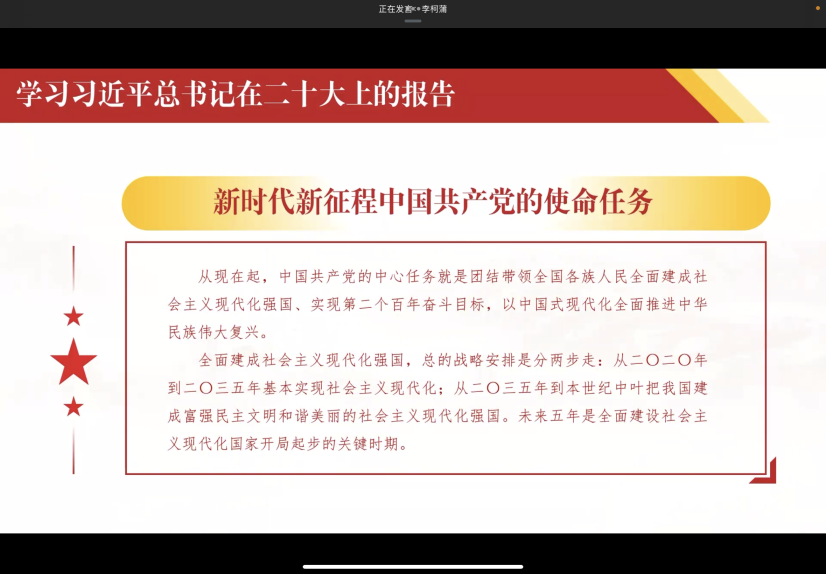 按照学院党委部署,10月17日至27日,我院各党支部集中开展“党的二十大精神学习”主题党日活动。各党支部通过理论学习、观看视频、专题研讨、交流心得和知识竞赛等方式组织线上学习研讨活动,充分学习并领会党的二十大精神。各基层教学单位统一开展专题政治学习,把学习党的二十大精神与教学科研工作实际相结合,深入开展教研、科研讨论交流,积极推动党的二十大精神“进课堂”、“进头脑”。大家一致表示,今后将不断学习、深刻领会、全面贯彻党的二十大报告精神,坚持用报告精神武装头脑、指导实践、推动日常学习工作,以高度的政治责任感、精益求精的态度和求真务实的作风,立足岗位实践,更好服务学院创新发展。