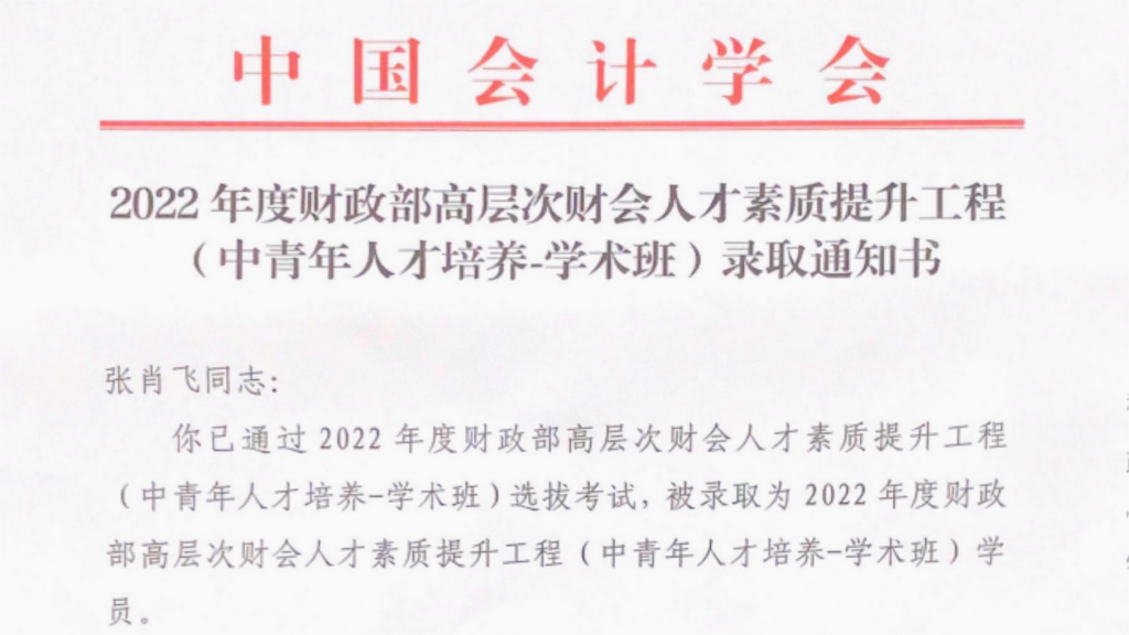 近日,2022年财政部高层次财会人才素质提升工程(中青年人才培养-学术班)选拔结果公示期已结束,我院张肖飞教授成功入选。
