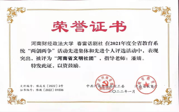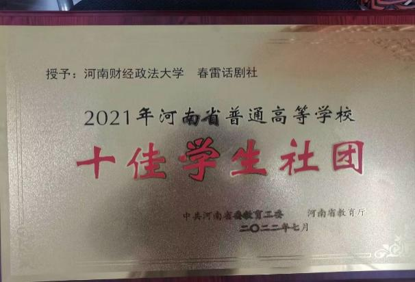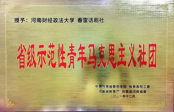 河南省示范性青年马克思主义社团春雷话剧社成立于1999年,以“演绎经典话剧、讲好‘三个故事’,传承红色基因、发扬革命精神(演绎话剧经典、讲好‘三个故事’,弘扬中国精神、坚定文化自信)”为理念,先后排演了《雷雨》《风声》《党的女儿》《江姐》《茶馆》《龙须沟》《威尼斯商人》《强渡大渡河》《觉醒青春》《红旗青年凿天渠》《信仰》《原野》等四十余部精彩话剧。获得河南省高校第三届“大美学工”十佳优秀学生工作品牌、第二届河南省“诚信校园行”短剧大赛特等奖、首届河南省青戏节“银象奖”“全国高校百强社团”“河南高校年度大学生社团”、河南省“青年马克思主义社团”“河南省文明社团”“河南省高校示范性马克思主义社团”、河南省高校“十佳学生社团”“河南省青年五四奖章集体”等荣誉。