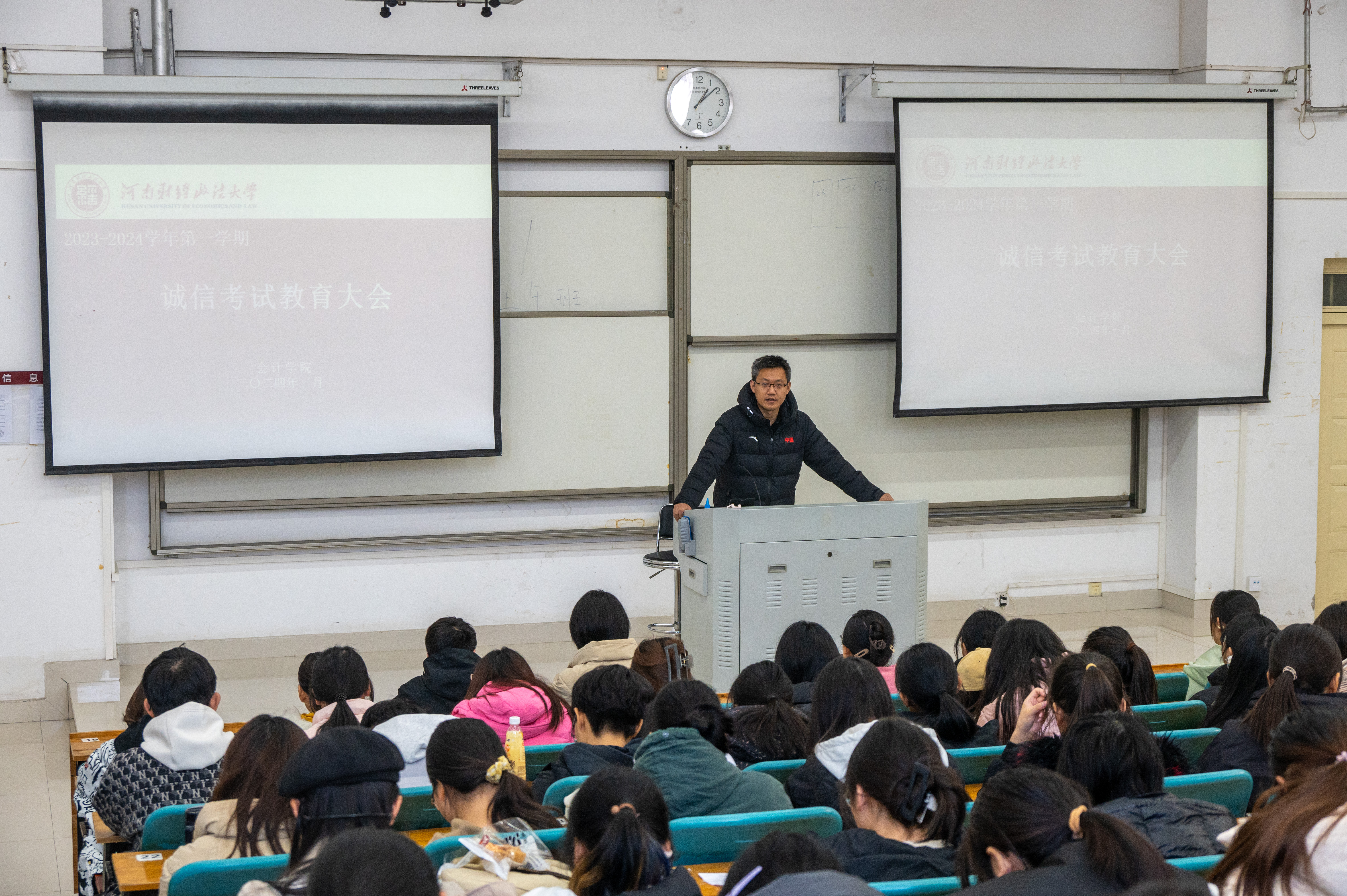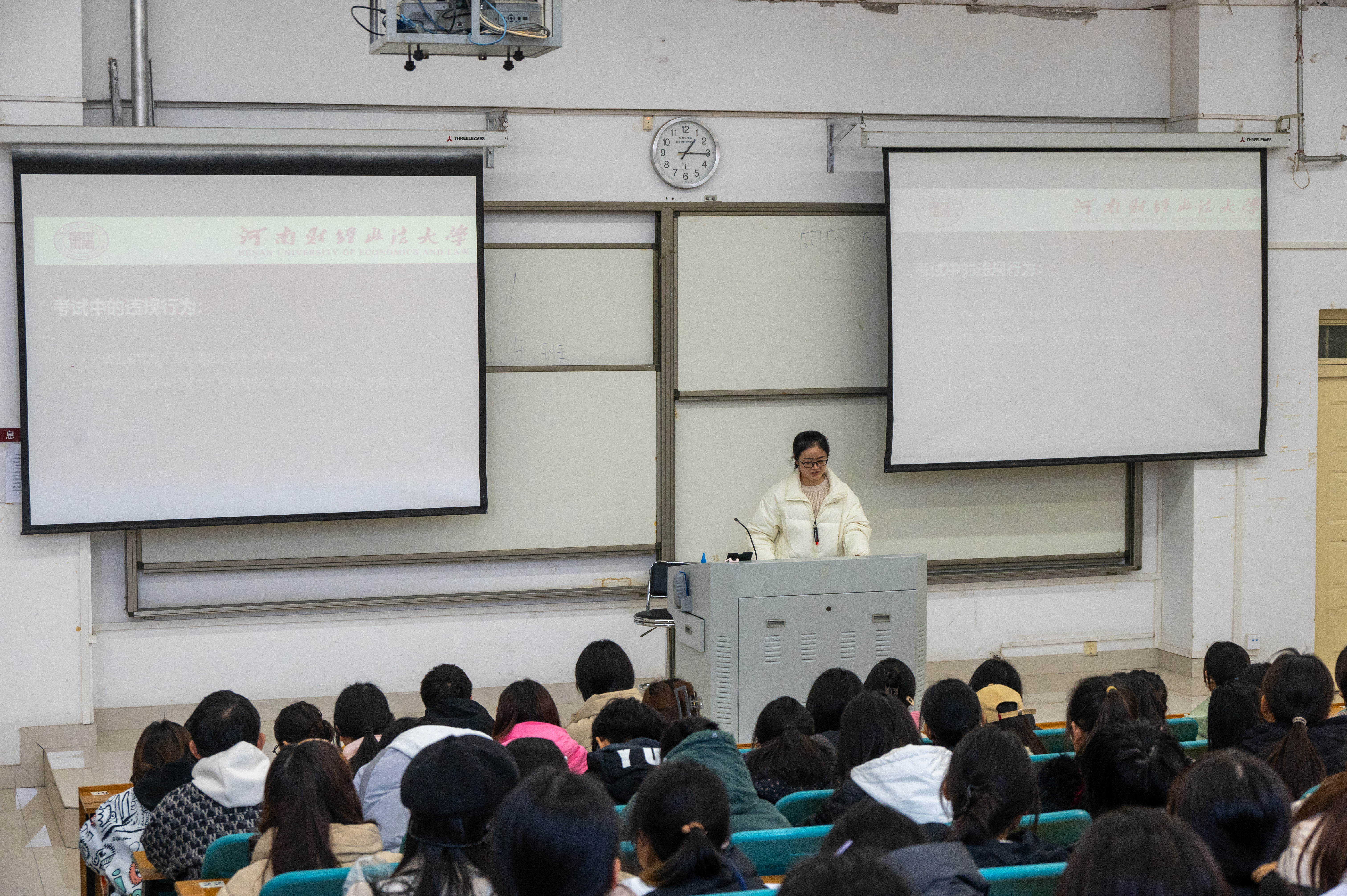 宋斌斌以“加强学风建设,倡导诚信考试”为主题,从考试、考纪、考风三个方面详细介绍了学生考试中需要注意的事项,要求同学们严肃考风考纪,摒弃侥幸心理,共同维护公平公正的学习和考试环境。23级辅导员马莹莹围绕“以案促改”典型案例,对学生进行警示教育,她指出同学们要明确学习目的,以期末考试检验学习成果,杜绝考试作弊现象,用实力考出优异的成绩,用诚信展现良好的学风。