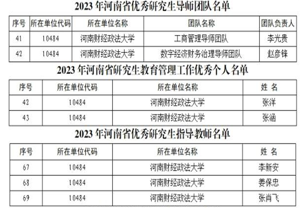 近日,省教育厅、省学位委员会印发《关于公布2023年河南省研究生教育先进团队和个人评选结果的通知》(教研〔2023〕438号),我院“数字经济财务治理”获得河南省优秀研究生导师团队,1名导师获评河南省优秀研究生指导教师。