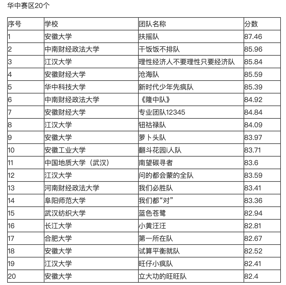 表1 华中赛区晋级队伍名单