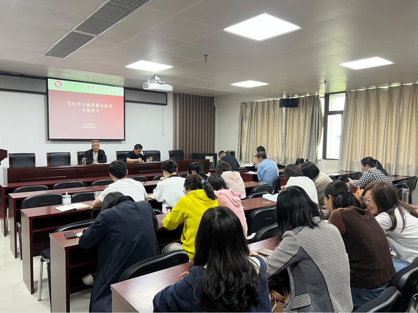 贺捷首先传达了学校关于开展党纪学习教育的会议精神,围绕目标要求、工作安排、组织领导等三个方面部署了学院党纪学习教育有关工作。随后,结合学术不端及师德师风问题等相关警示案例,强调党纪学习教育要坚持结合学院实际,采取集中学习、案例剖析、警示教育等多种形式展开,提高党纪学习教育的针对性和实效性。最后,贺捷领学了《中国共产党纪律处分条例》,并结合具体条款、适用范围进行深入解读。