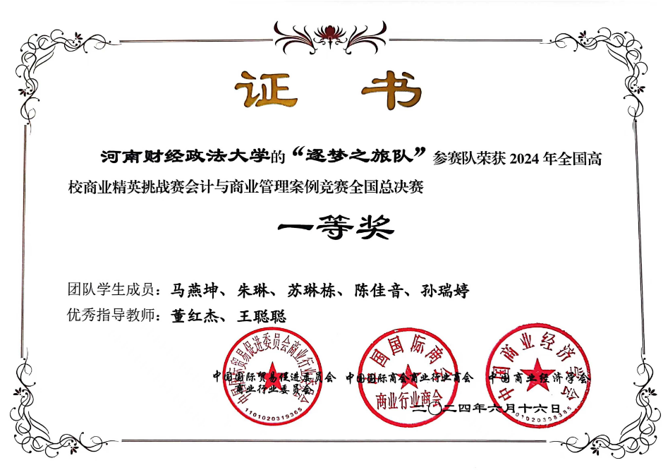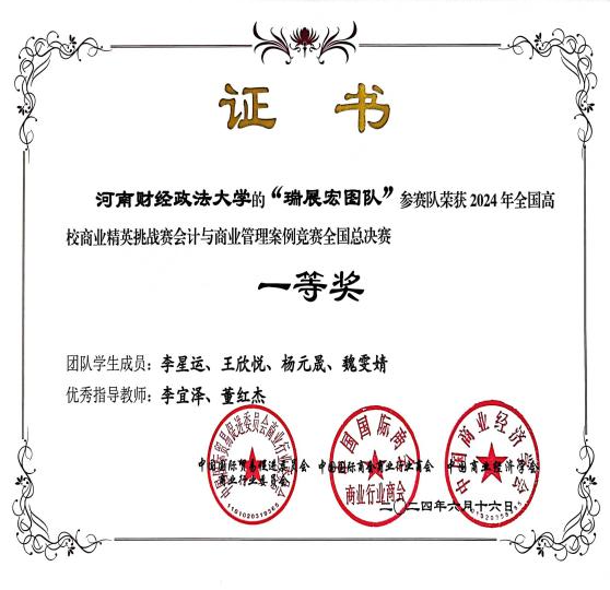 6月16日,2024年全国高校商业精英挑战赛会计与商业管理案例总决赛成功举办。大赛由中国贸促会商业行业委员会、中国国际商会商业行业商会、中国商业经济学会主办。全国30个省、自治区、直辖市共有来自武汉大学、中山大学、南京大学等500余所高校、7000余支队伍参赛。经过知识赛和区域赛,共有1744支队伍入围全国总决赛。我院本科生李星运、王欣悦、杨元晟、魏雯婧组成的瑞展宏图队和研究生马燕坤、朱琳、苏琳栋、陈佳音、孙瑞婷组成的逐梦之旅队,在李宜泽、董红杰、王聪聪三位老师的指导下代表我校参赛并分别斩获全国本科队和研究生队一等奖。