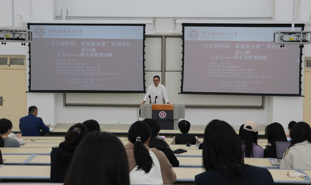 夏立军教授现为教育部重大人才计划特聘教授、上海交通大学二级教授、博士生导师,长期致力于中国资本市场会计、审计、公司治理和公共治理问题的研究。在此次讲座中,夏教授以“大会计——横看成岭侧成峰”为主题,从“大会计”视角,分析了会计学科从不同视角展现的多样性与复杂性,阐述了如何从全球化背景下审视财务会计在国企考核中的重要性。他强调,会计不仅仅是财务数据的记录者,更是战略决策的重要支持者,通过多维度的财务分析,帮助企业在全球竞争中获得优势。