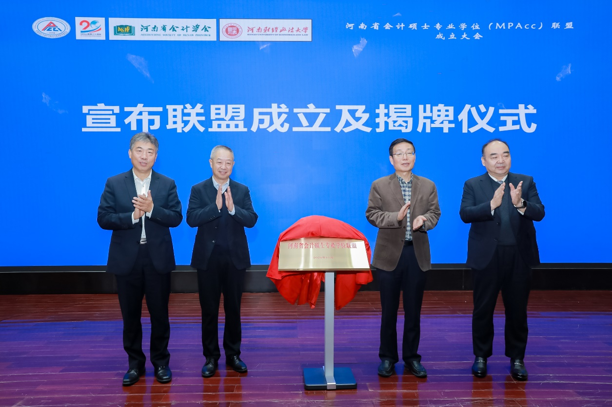 通过投票和表决,曹克舜宣布河南省会计硕士专业学位(MPAcc)联盟正式成立!司林胜、王化成、杨文献、曹克舜共同为联盟揭牌。