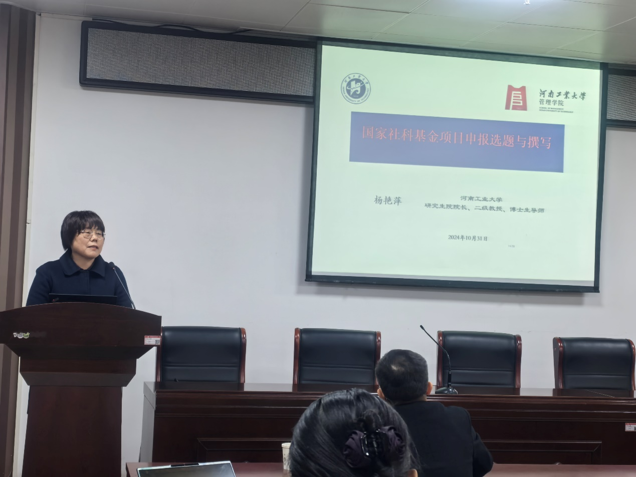 11月4日下午,管理学部william威廉中文邀请河南工业大学研究生院院长杨艳萍教授作“国家社科基金项目申报选题与撰写”专题报告。本次报告由william威廉中文院长谢香兵主持,旨在提升教师申报国家社科基金项目的能力,助力我校学术水平的全面提升。