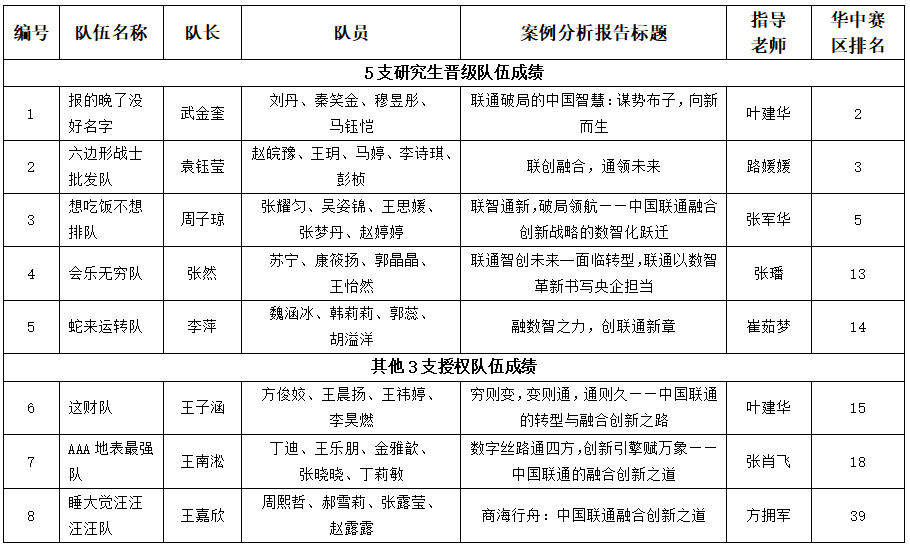 MPAcc教育指导委员会官网显示,全国各会计专硕培养单位共组建了3173支研究生队伍参加本次比赛,其中华中赛区各培养单位组建了411支队伍参加比赛,17支队伍晋级第二阶段比赛,我校研究生组共5支队伍晋级第二阶段比赛,占比近1/3。