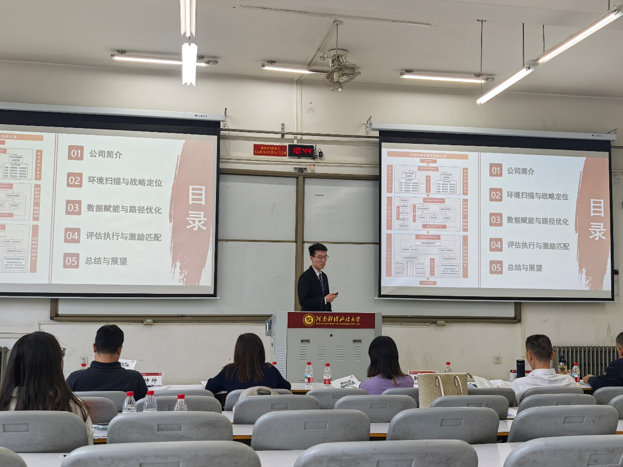 致辞结束后,赛事进入精彩对决环节。上午进行的复赛环节,16支队伍在两个平行赛场同台竞技。每支队伍结合联通公司融合创新案例,通过现场PPT展示,阐述企业背景、问题分析与解决方案。各队选手理论功底扎实,逻辑清晰,内容紧贴实务,展现出较高的专业水准。评委专家根据表现进行打分,现场秩序井然、交流氛围浓厚,充分展现了MPAcc研究生“能分析、会表达、善协作”的能力素养。