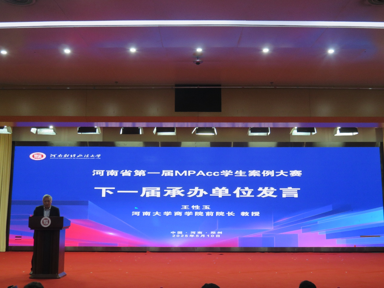 在闭幕式上,大赛组委会宣布,下一届河南省MPAcc学生案例大赛将由河南大学商学院承办。河南大学商学院相关负责人代表下一届承办单位发表讲话,表示将认真学习本届大赛成功经验,持续优化赛事组织和服务保障,推动MPAcc案例教学与竞赛机制融合发展,努力把下一届赛事办得更加专业、更加精彩、更加有影响力,为我省会计硕士教育高质量发展持续赋能。