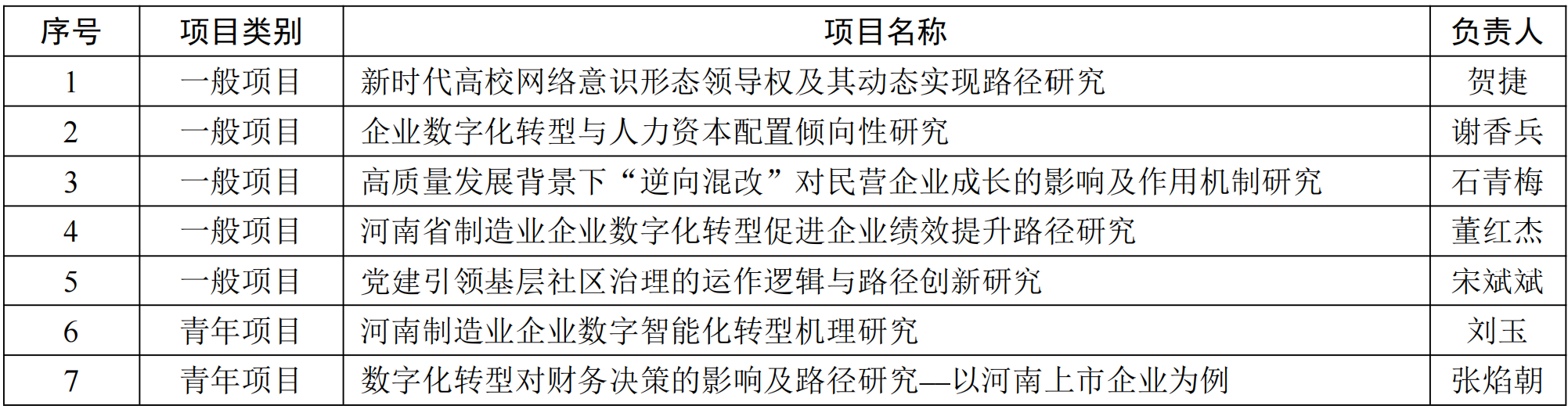 近日,在2022年度河南省哲学社会科学规划项目评审中,我院7项项目成功获批立项。河南省哲学社科规划项目是我省哲学社会科学领域最高层次的科研项目,是衡量哲学社会科学发展程度、科研实力、研究水平的重要标志。7位教师研究项目的成功立项标志着我院科研水平的稳步提升,对于推动我院营造良好学术氛围、提高创新研究能力具有重要意义。