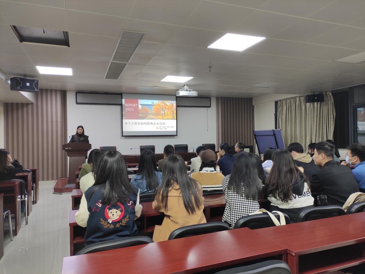主讲人为2020级会计学术研究生申子峰,其报告题目为“多个大股东如何影响企业违规行为”,从引言、文献述评、理论分析与假设提出、研究设计、回归结果与分析、异质性分析以及结论与启示等方面全面讲述了该篇论文。分享结束后,董教授针对论文存在的相关问题提出了完善建议,20级、21级研究生代表围绕论文以及学术训练过程进行了交流。